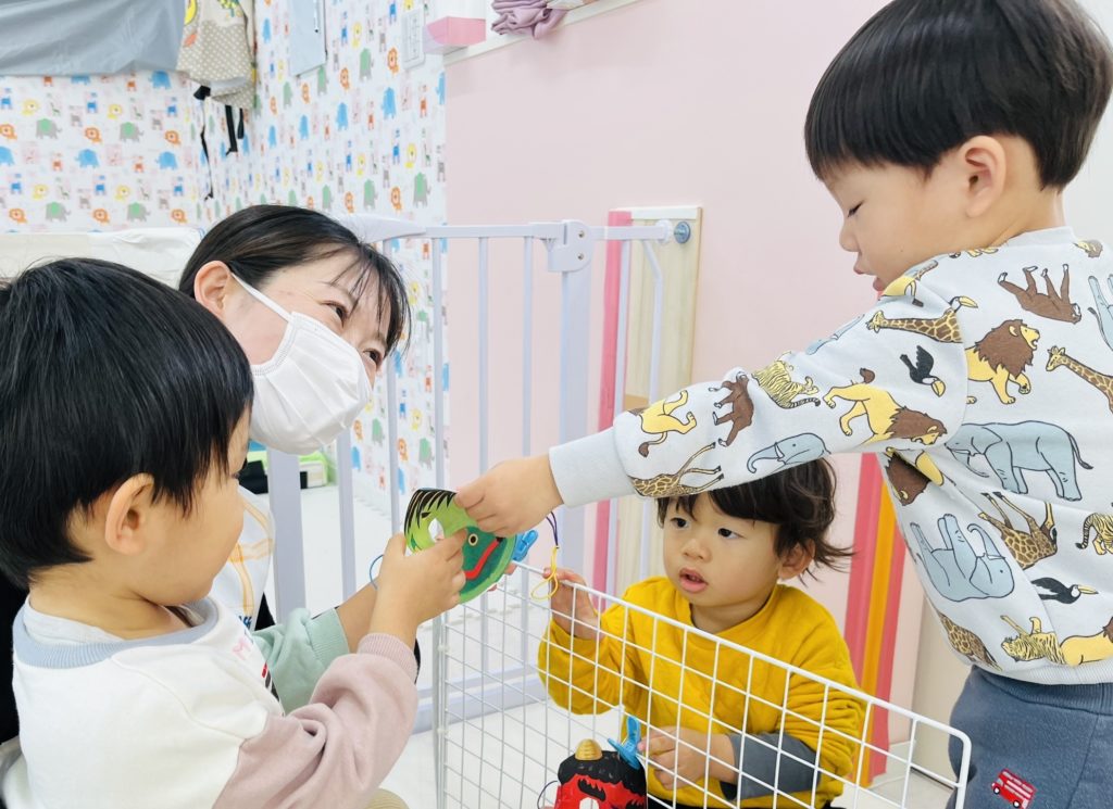 「これください」「はい」「どうぞ〜!」とおもちゃのお金を渡して、お客さんになったり、お店屋さんになりきって遊びました😊