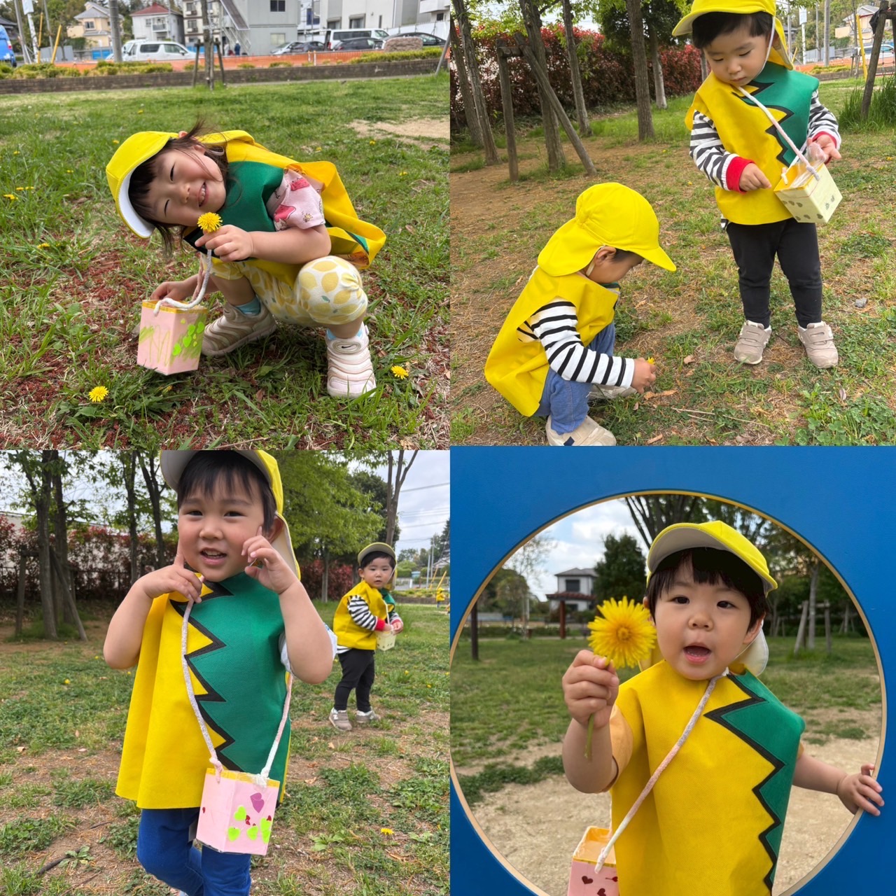 2025.05.09たんぽぽ摘み(浦和中尾) 保育園大きなぞうさん浦和中尾 うさぎ組たんぽぽ摘みに行ってきました! たんぽぽ摘みが大好きなこどもたち♡ 普段から園庭に咲いているたんぽぽを見つけるたびに、目を輝かせていました。 たんぽぽ衣装を着てオリジナルバックを作って公園へ出発!公園に行くとたくさんのたんぽぽを発見しました!